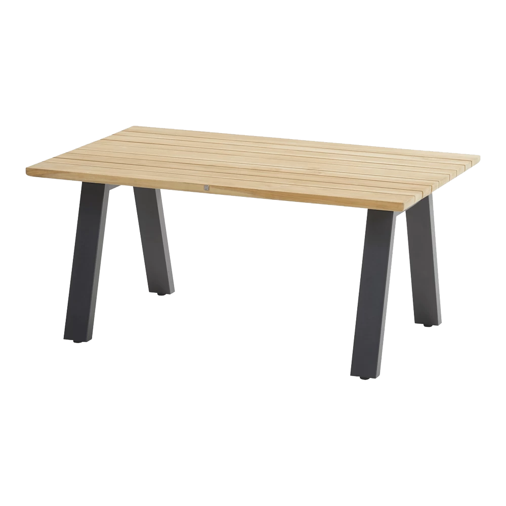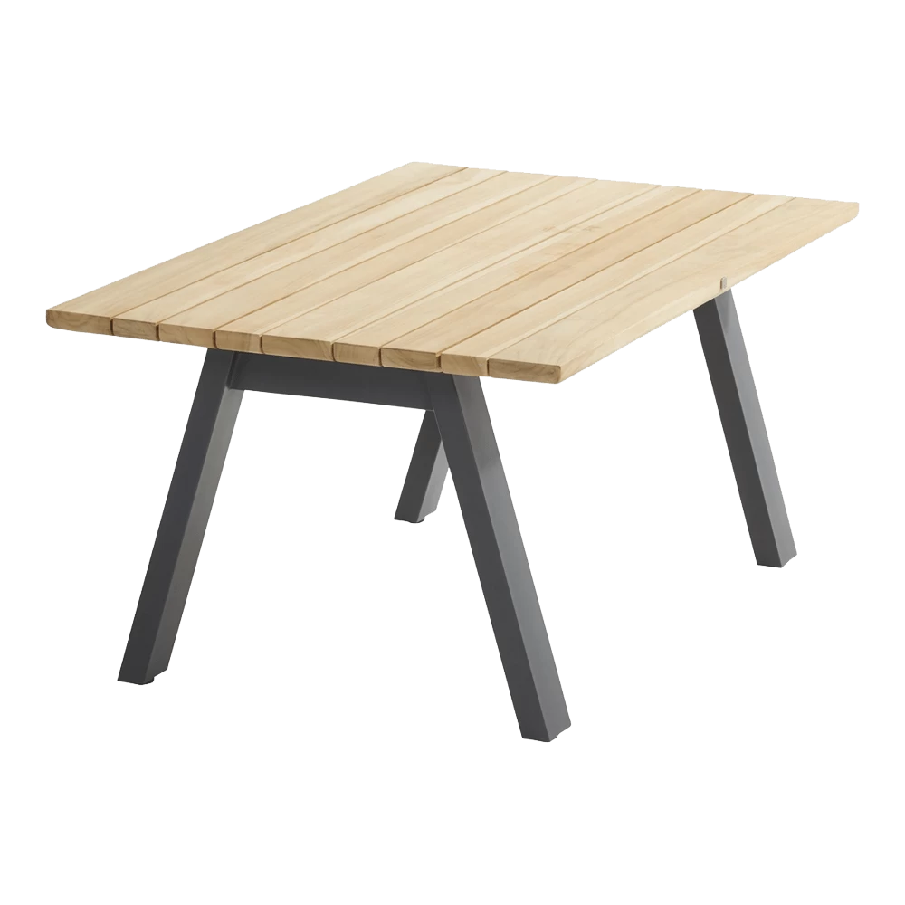 Het tafelblad van deze mooie Ambassador salontafel is van teakhout. De teak latten verschillen van breedte, waardoor het tafelblad er dynamisch en luxueus uitziet. Teak kan het hele jaar buiten blijven staan. Het is prima weerbestendig, om het hout mooi te houden adviseren we je om het goed te onderhouden met de onderhoudsproducten van 4 Seasons Outdoor.