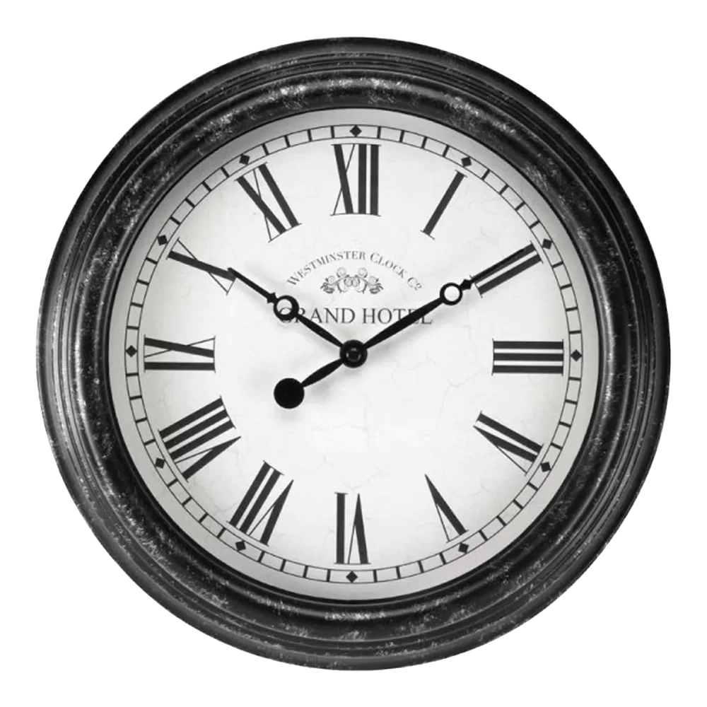 Klassieke klok met zwart verweerde rand en romeinse cijfers. Heeft 1 AA batterij nodig om te werken. 2 jaar garantie.