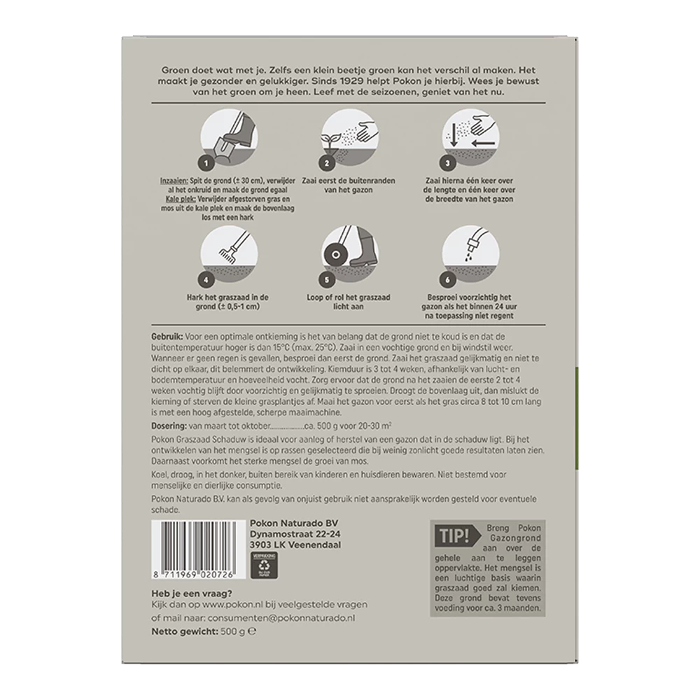 Pokon Graszaad Schaduw is ideaal voor aanleg of herstel van een gazon dat in de schaduw ligt. Bij het ontwikkelen van het mengsel is op rassen geselecteerd die bij weinig zonlicht goede resultaten laten zien. Daarnaast voorkomt het sterke mengsel de groei van mos. Voor een optimale kieming is het van belang dat de grond niet te koud is en dat de buitentemperatuur hoger is dan 15°C (max. 25°C). Zaai in een vochtige grond en bij windstil weer. Wanneer er geen regen is gevallen, besproei dan eerst de grond. Zaai het graszaad gelijkmatig en niet te dicht op elkaar, dit belemmert de ontwikkeling. Kiemduur is 3 tot 4 weken, afhankelijk van lucht- en bodemtemperatuur en hoeveelheid vocht. Zorg ervoor dat de grond na het zaaien de eerste 2 tot 4 weken vochtig blijft door voorzichtig en gelijkmatig te sproeien. Droogt de bovenlaag uit, dan mislukt de kieming of sterven de kleine grasplantjes af. Maai het gazon voor het eerst als het gras circa 8 tot 10 cm lang is met een hoog afgestelde, scherpe maaimachine.