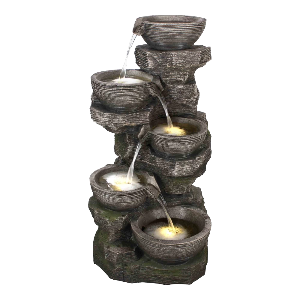 Geniet van een mooi waterspel in de tuin met Waterornament Praha. Deze tuinfontein is 100cm hoog en gemaakt van polystone, een harde en licht gewicht kunststof. Het waterornament heeft een mooie stonelook in de kleur grijs en is afgewerkt met groene details, waardoor hij nog meer op een echte rots lijkt. Door de vijf grijze waterschalen, die op verschillende hoogtes geplaatst zijn, loopt het water naar beneden. Dit geeft een rustgevend geluid. Vier waterschalen zijn elk voorzien van één LED lampje, waardoor het ornament ook in de avond extra sfeervol is.